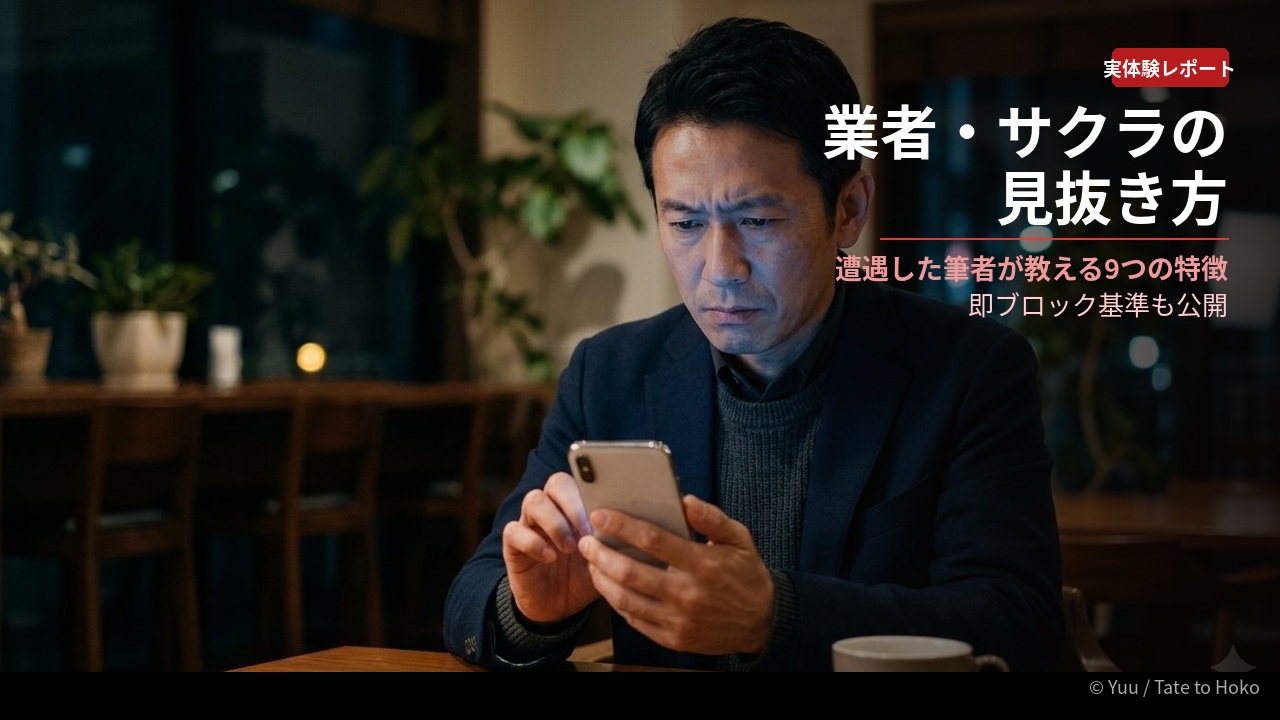 この記事では、筆者が実際に遭遇した業者・サクラの特徴9つと、本物の既婚者女性との見分け方、即ブロックすべき基準を正直に書きます。