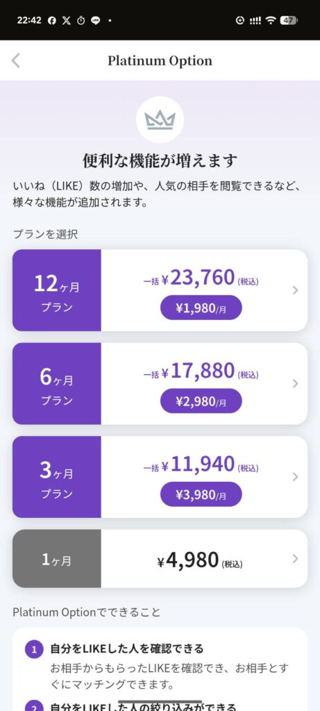 足跡確認・いいねしてくれた相手の表示・優先表示はPlatinum Optionが必要です。両方加入すると月額が大幅に上がります。