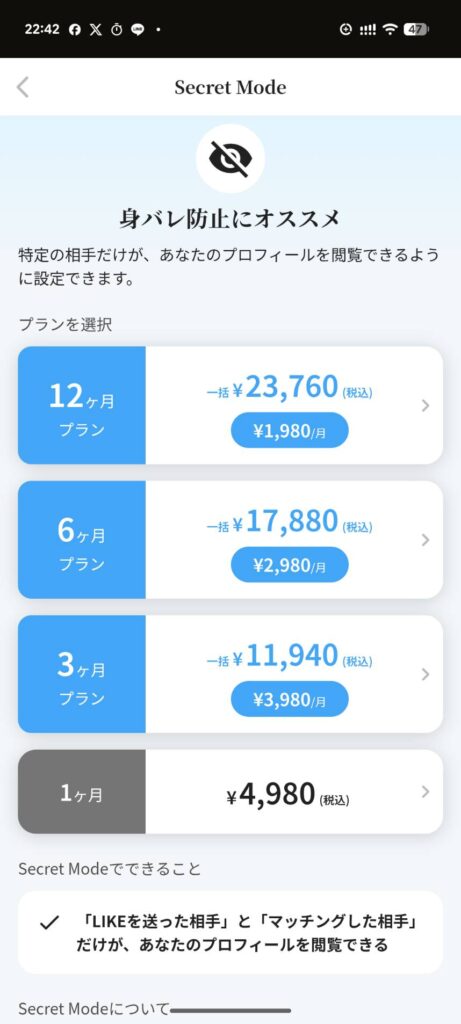 「シークレットモードが有料オプション。ヒールメイトは無料で同等機能が使えるので、身バレが特に心配な人はそちらの方がいいかも。」