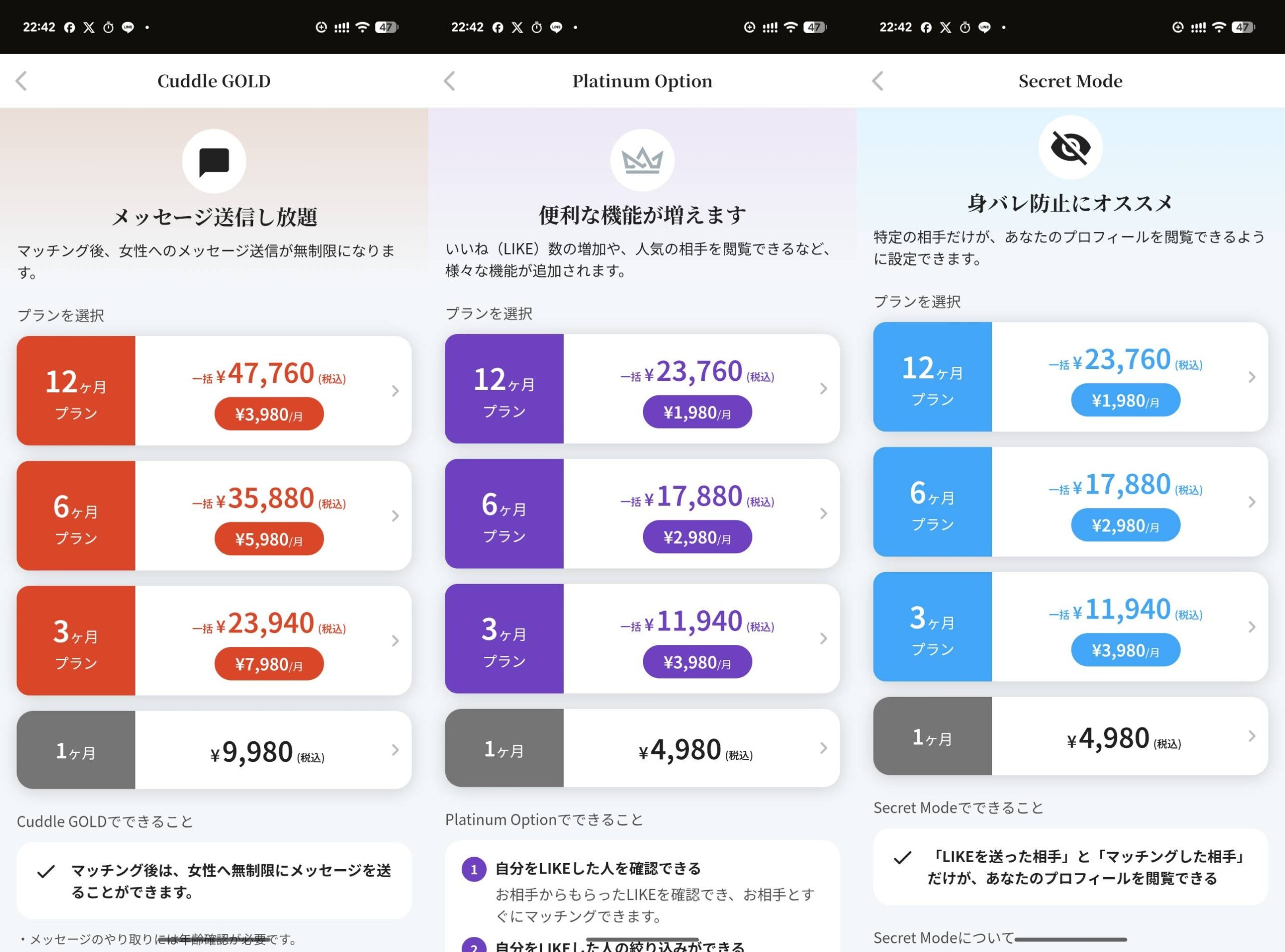 左からCuddle GOLD・Platinum Option・Secret Modeの料金画面。 実際のアプリ上での表示。