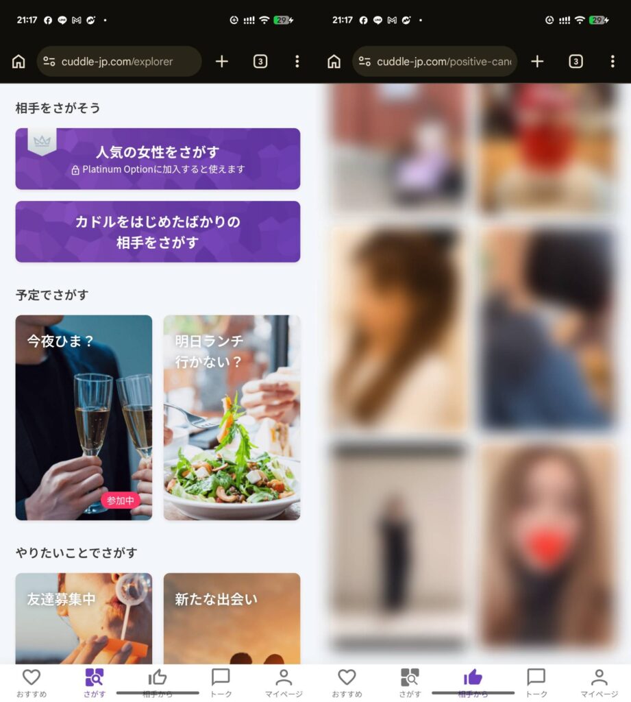 カドルの「さがす」画面(左)と、いいねしてくれた相手一覧(右)。 女性会員の写真にはデフォルトでぼかしがかかっており、身バレ対策が徹底されている。