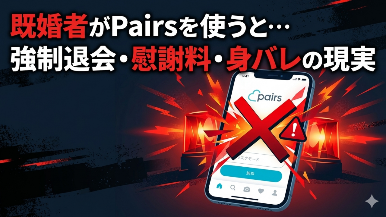 Pairs・Omiai・Tinder・with・タップルなどは、利用規約で「未婚者限定」または「既婚者の利用禁止」を明示しています。規約違反が発覚すると、強制退会・アカウント永久停止の対象となります。